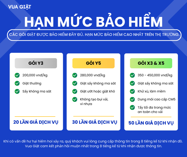Mỗi đơn hàng tại Vua Giặt đều được bảo hiểm chất liệu, với giá trị đền bù từ 10 đến 50 lần phí dịch vụ, tùy theo gói chăm sóc.